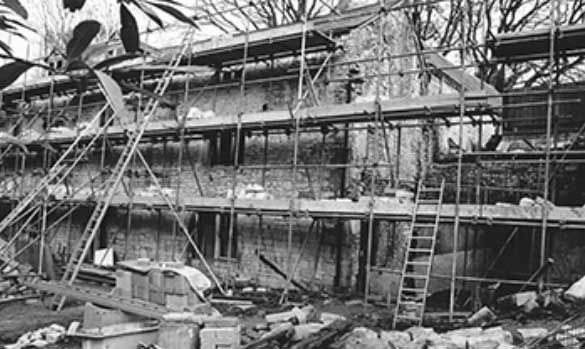 Arundel Mill House and Cottages were in a ruinous state when Stroud Preservation Trust bought them in February 1990. Cracks in the walls visibly widened during the months when the Trust was negotiating to buy. Once the sale of the property was completed, emergency work began the same day to prop up the Mill House. This was a large, complex and expensive project which took three years to complete.